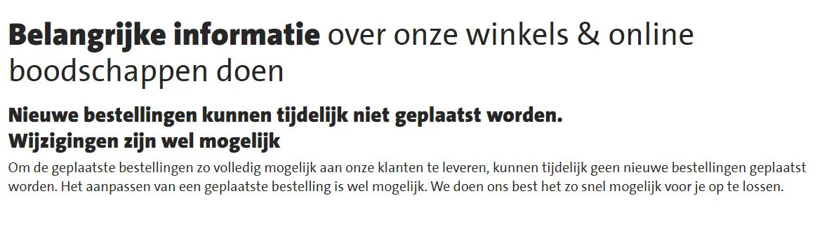Jumbo meldt zelf op zijn website dat het op dit moment niet mogelijk is om een bestelling te doen. ‘Nieuwe bestellingen kunnen tijdelijk niet geplaatst worden. Wijzigingen zijn wel mogelijk. Om de geplaatste bestellingen zo volledig mogelijk aan onze klanten te leveren, kunnen tijdelijk geen nieuwe bestellingen geplaatst worden. Het aanpassen van een geplaatste bestelling is wel mogelijk. We doen ons best het zo snel mogelijk voor je op te lossen’, meldt de formule.