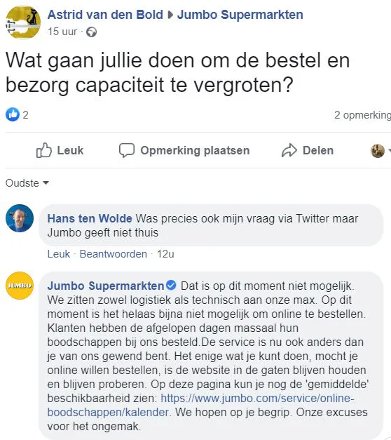 Ook op Facebook (zie onder) legt de formule de situatie uit aan klanten die klagen over de onlinesituatie. Zo vraagt een klant waarom Jumbo de onlinecapaciteit niet verhoogt. ‘Dat is op dit moment niet mogelijk. We zitten zowel logistiek als technisch aan onze max. Op dit moment is het helaas bijna niet mogelijk om online te bestellen. Klanten hebben de afgelopen dagen massaal hun boodschappen bij ons besteld. De service is nu ook anders dan je van ons gewend bent. Het enige wat je kunt doen, mocht je online willen bestellen, is de website in de gaten blijven houden en blijven proberen’, meldt het webcareteam van Jumbo op Facebook.